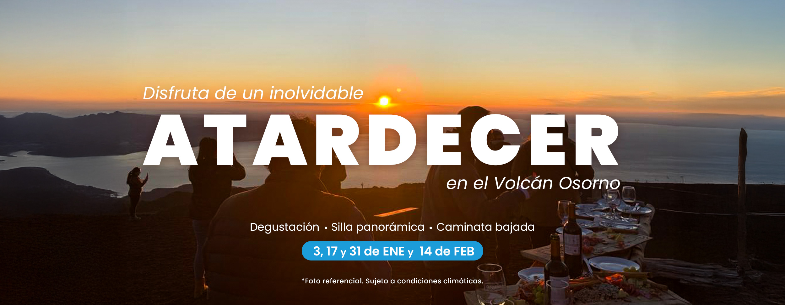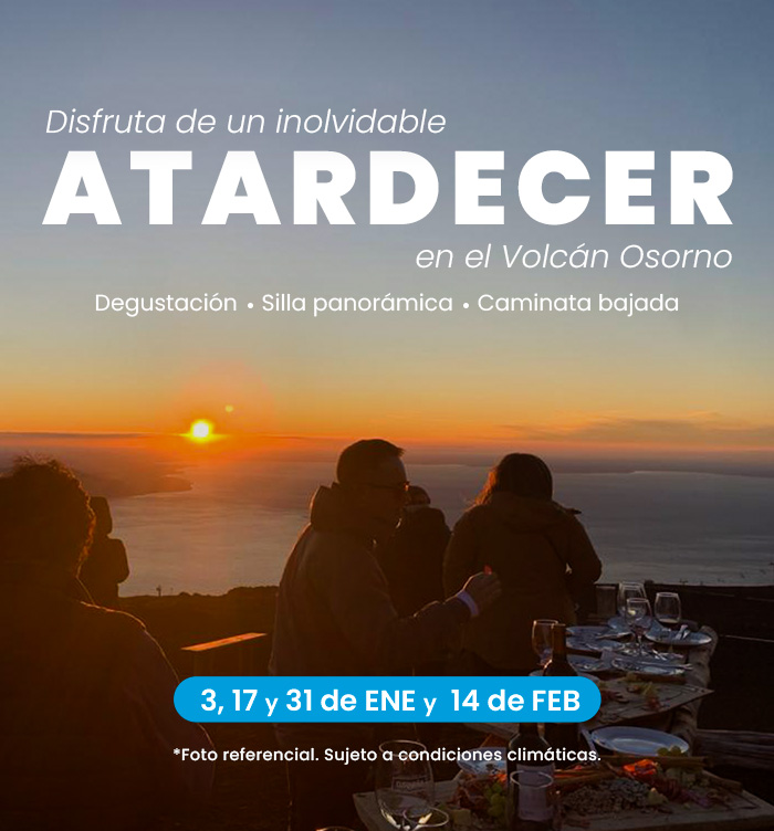 ¡Disfruta de un atardecer inolvidable en el Volcán Osorno! A partir del mes de enero, los días sábados 3, 17 y 31, además del sábado 14 de febrero nuestra experiencia «Sunset» será el panorama perfecto si buscas un momento diferente y relajado en un escenario increíble como el Volcán Osorno.